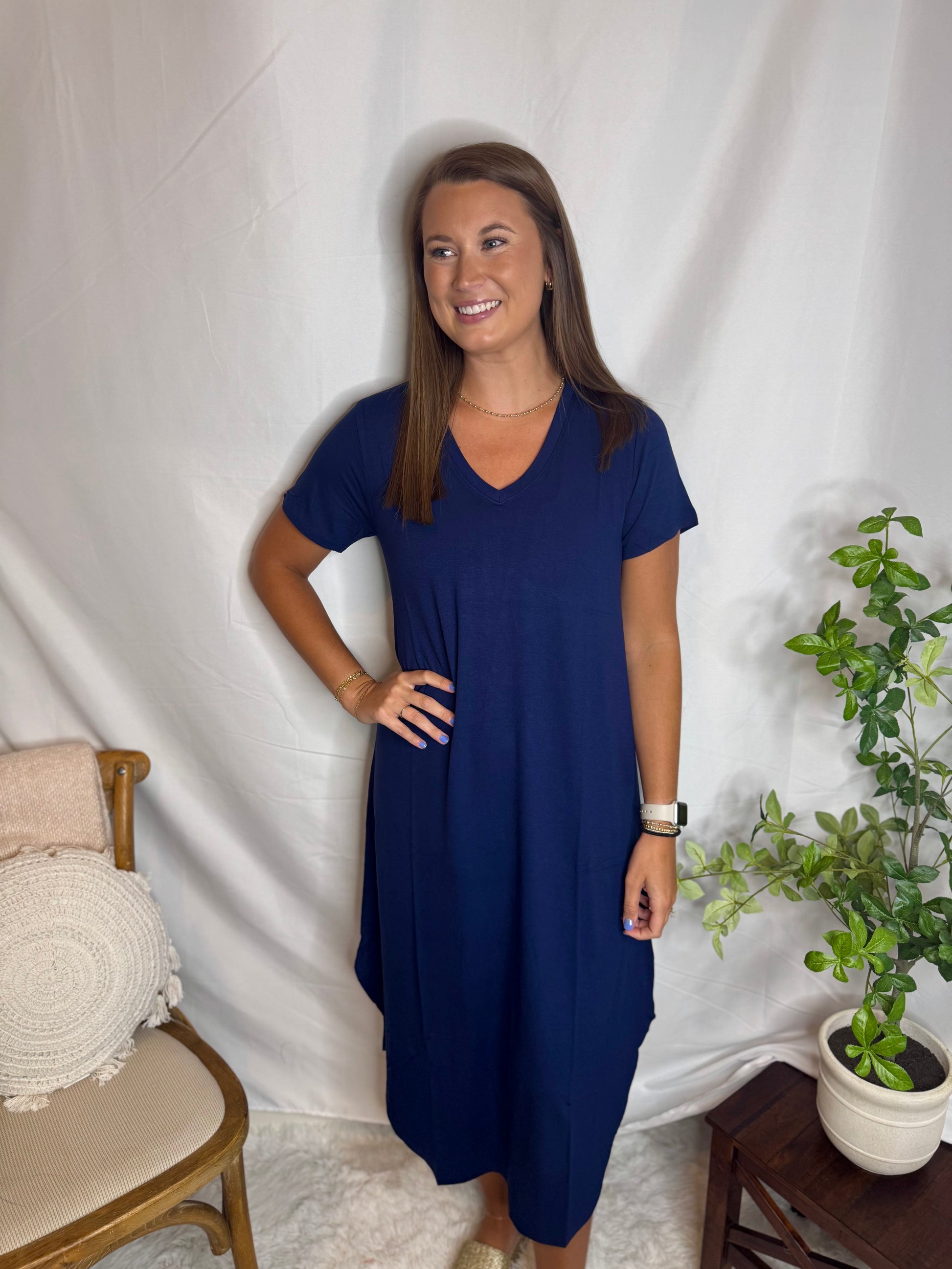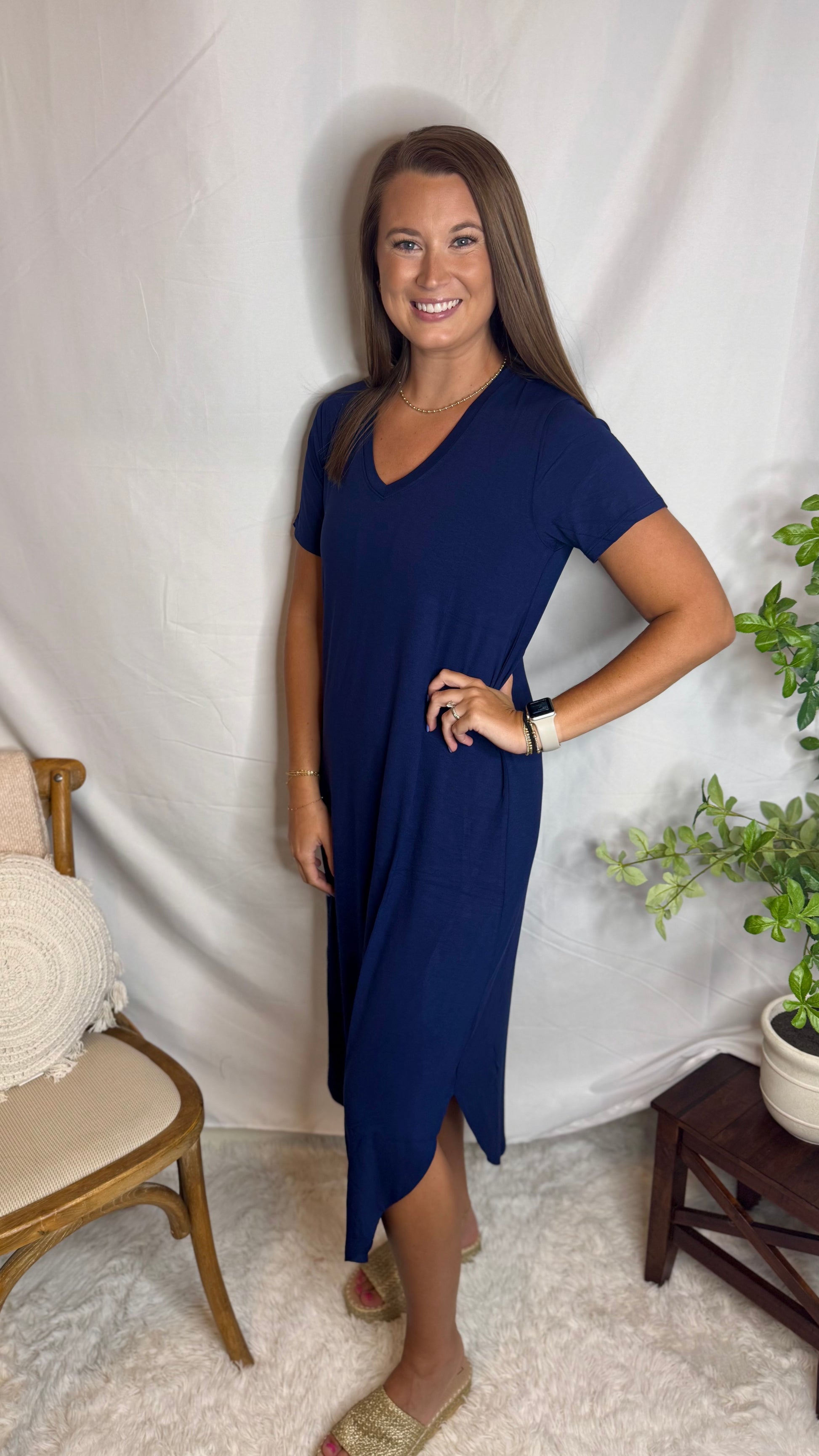 Midi Dress Featuring A V-Neckline And Short Sleeves, Designed With A Flattering Fit That Follows The Natural Silhouette. Finished With A Curved Hemline For Added Shape And Movement. Suitable For Everyday Wear And Casual Styling. 95% Rayon / 5% Spandex