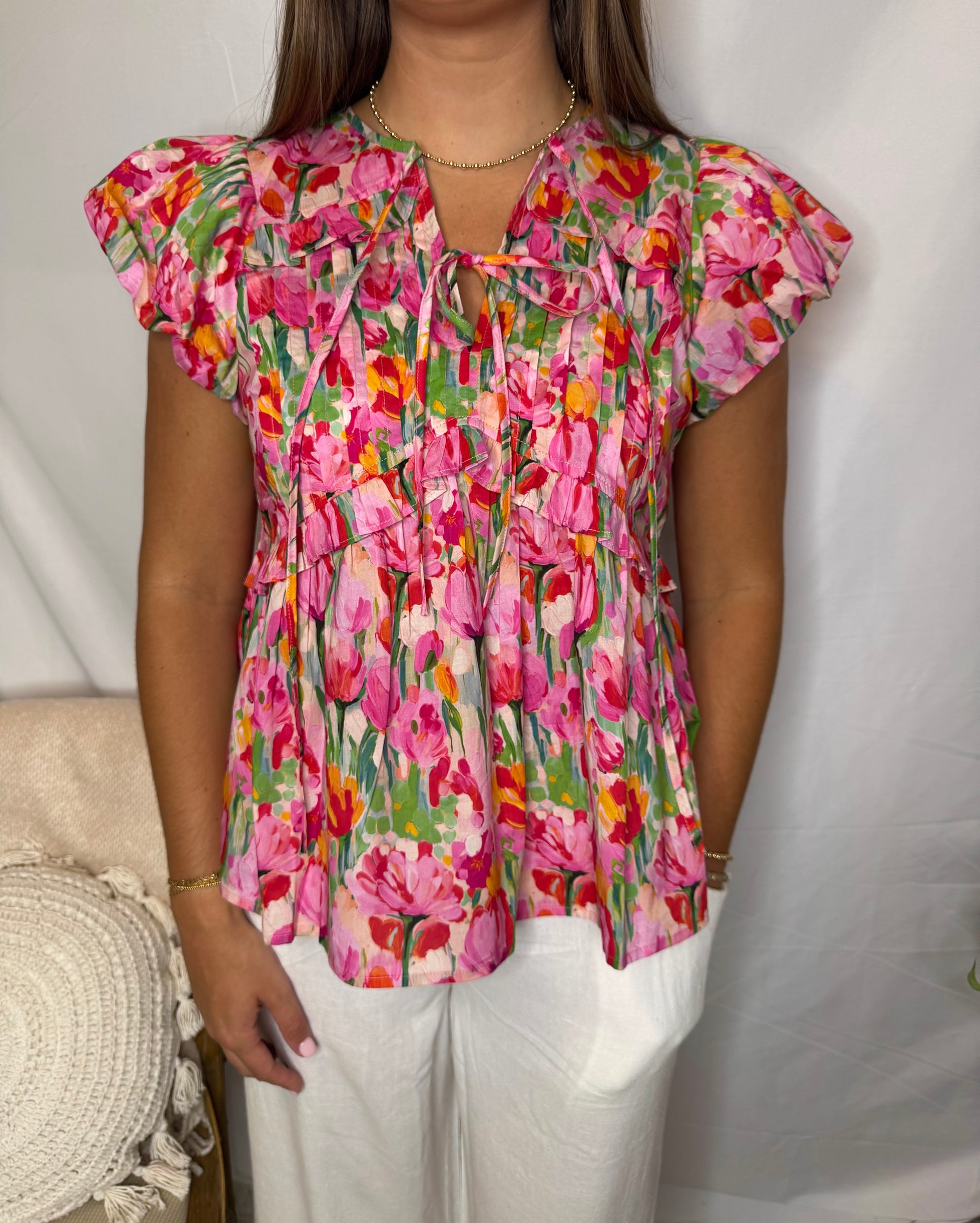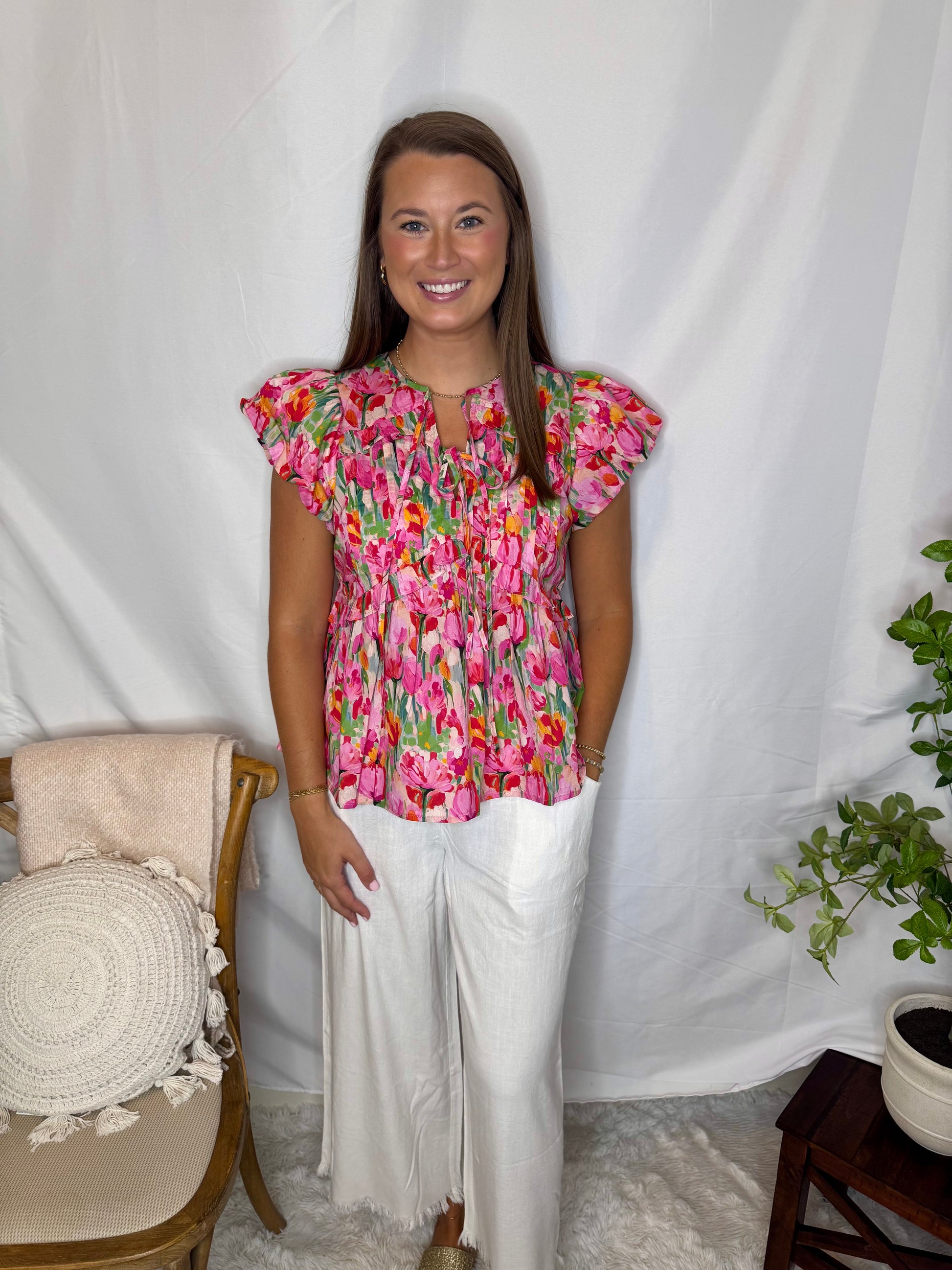 The Peony Pink Top is BEAUTIFUL!!! This top features a gorgeous pink floral print with gorgeous detailing everywhere!! We paired this top with our White Umgee Pants!