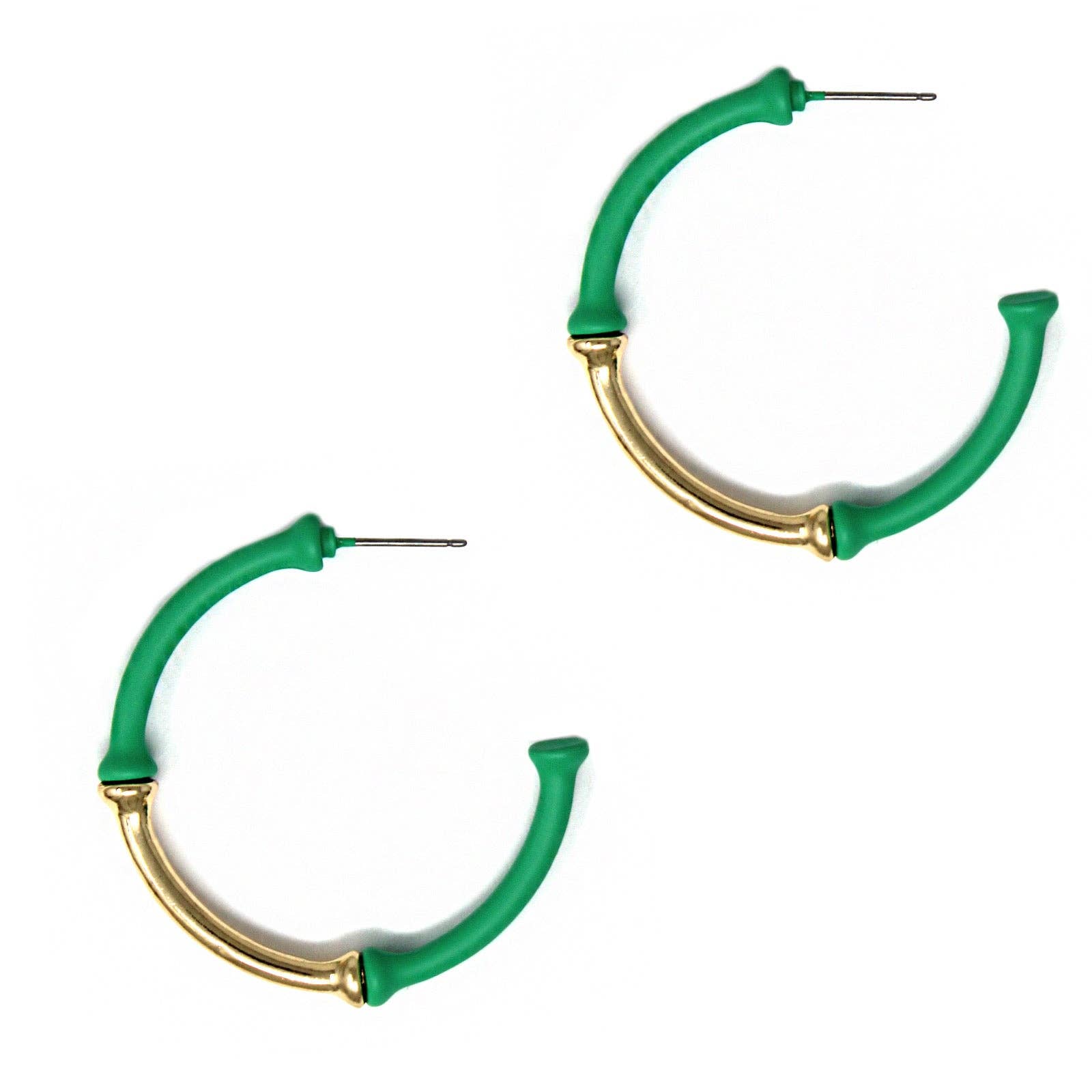 Dazzle with these Green and Gold Bamboo Hoops featuring a vibrant color coating. These lightweight hoop earrings are perfect for adding a pop of color to any outfit while remaining comfortable to wear. Elevate your style with these trendy, statement earrings.