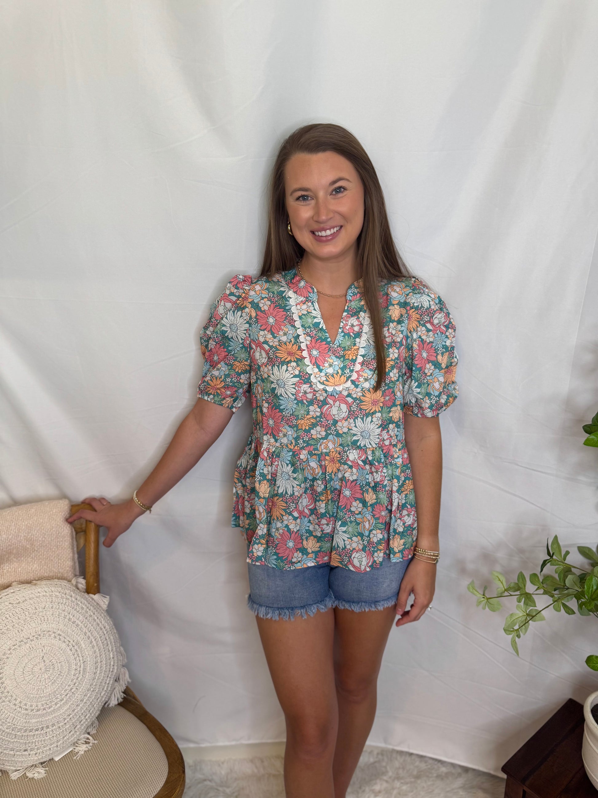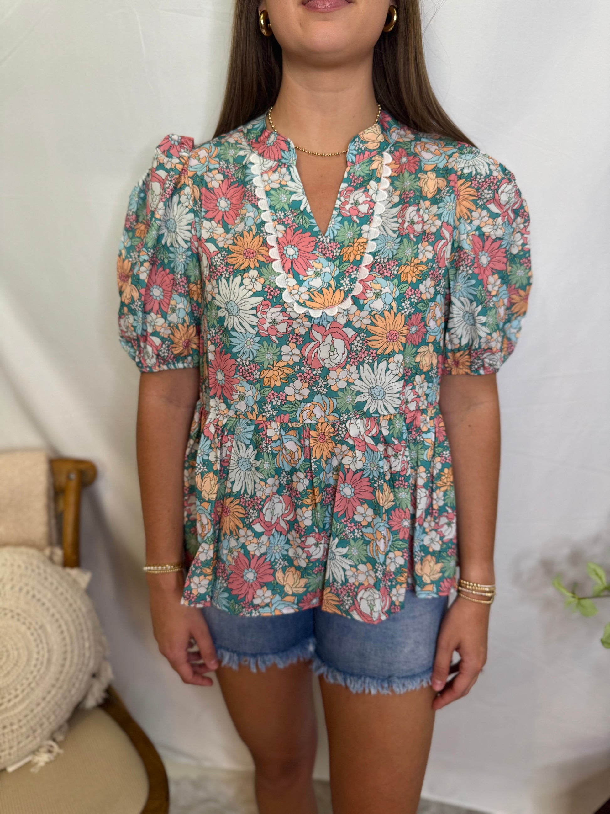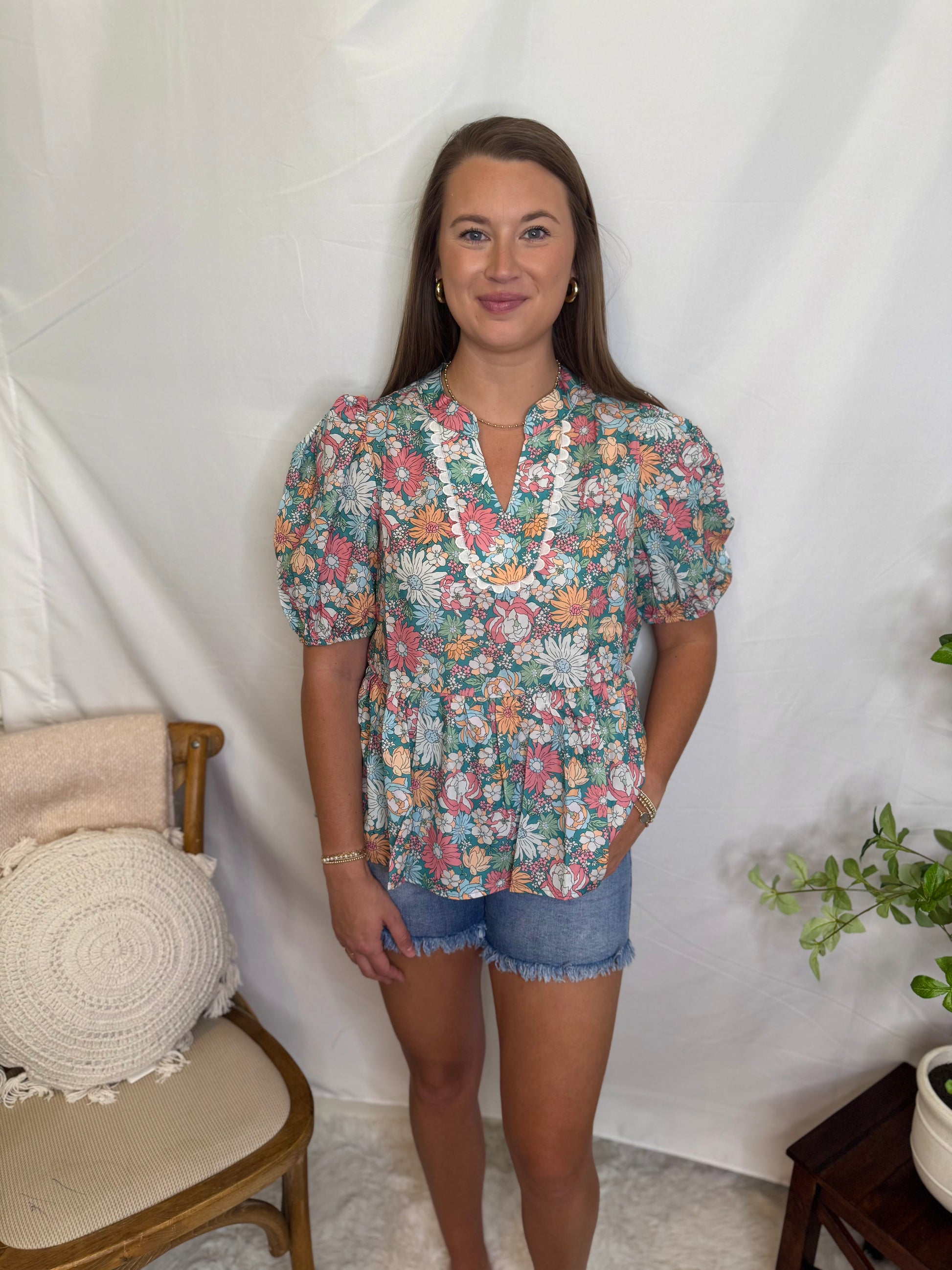Material 100%Polyester. Elevate your style with this fresh and feminine floral blouse, perfect for a chic and romantic ensemble. The unique notched neck detail brings a touch of sophistication, adding a modern twist to the design. Puff sleeves enhance the blouse with a stylish and romantic silhouette, making it a versatile piece for both casual and dressy occasions.