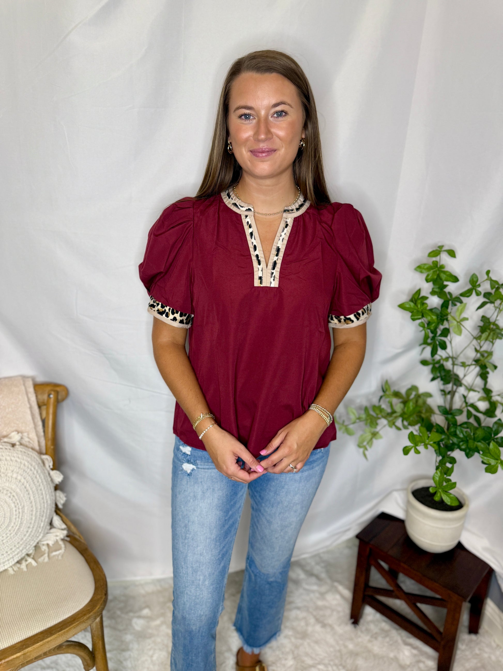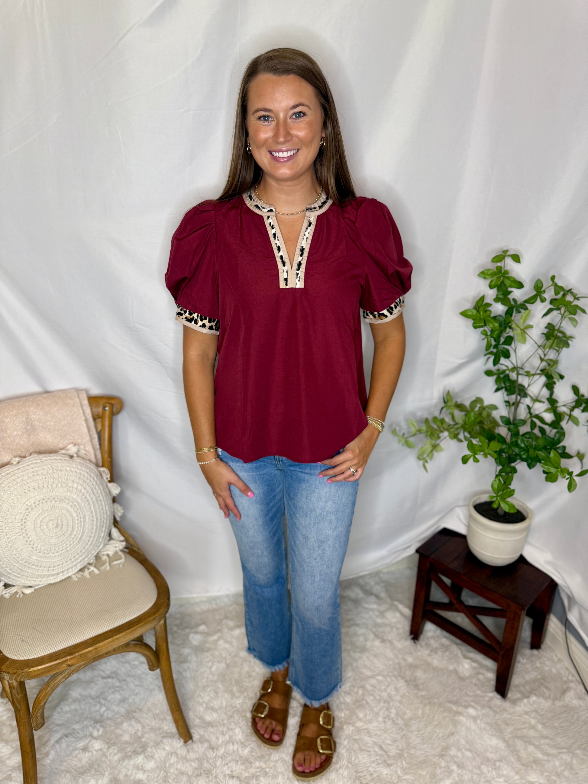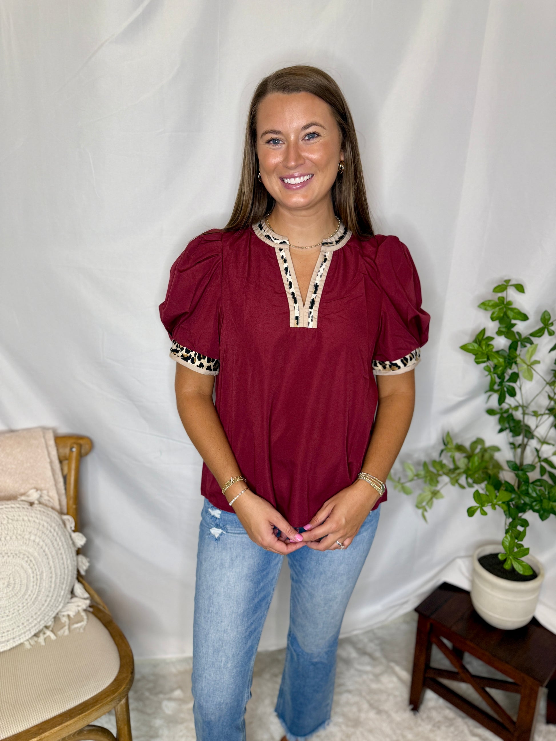 This one’s giving fierce meets feminine 🍷🐆 — our Wine & Wild Top is the perfect pop of bold color with a little edge! Featuring statement puff sleeves, contrast leopard trim, and a relaxed fit, it’s an easy pick for game days, casual Fridays, or dinner out.