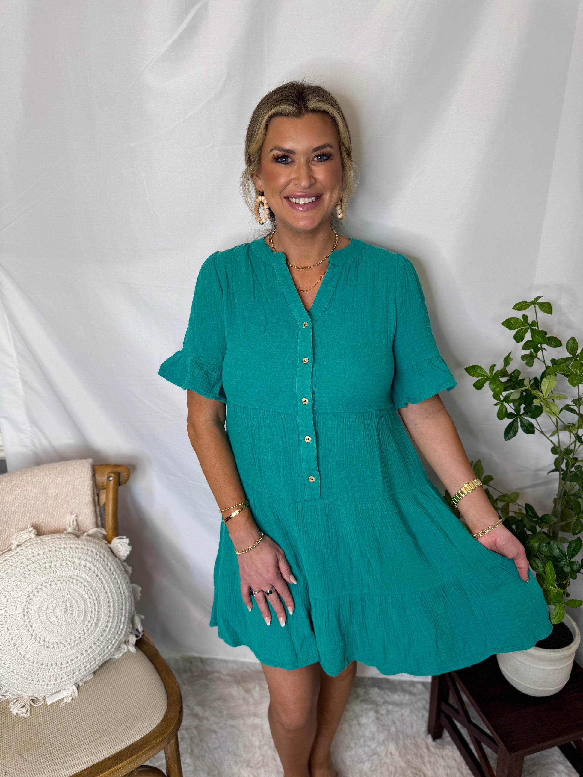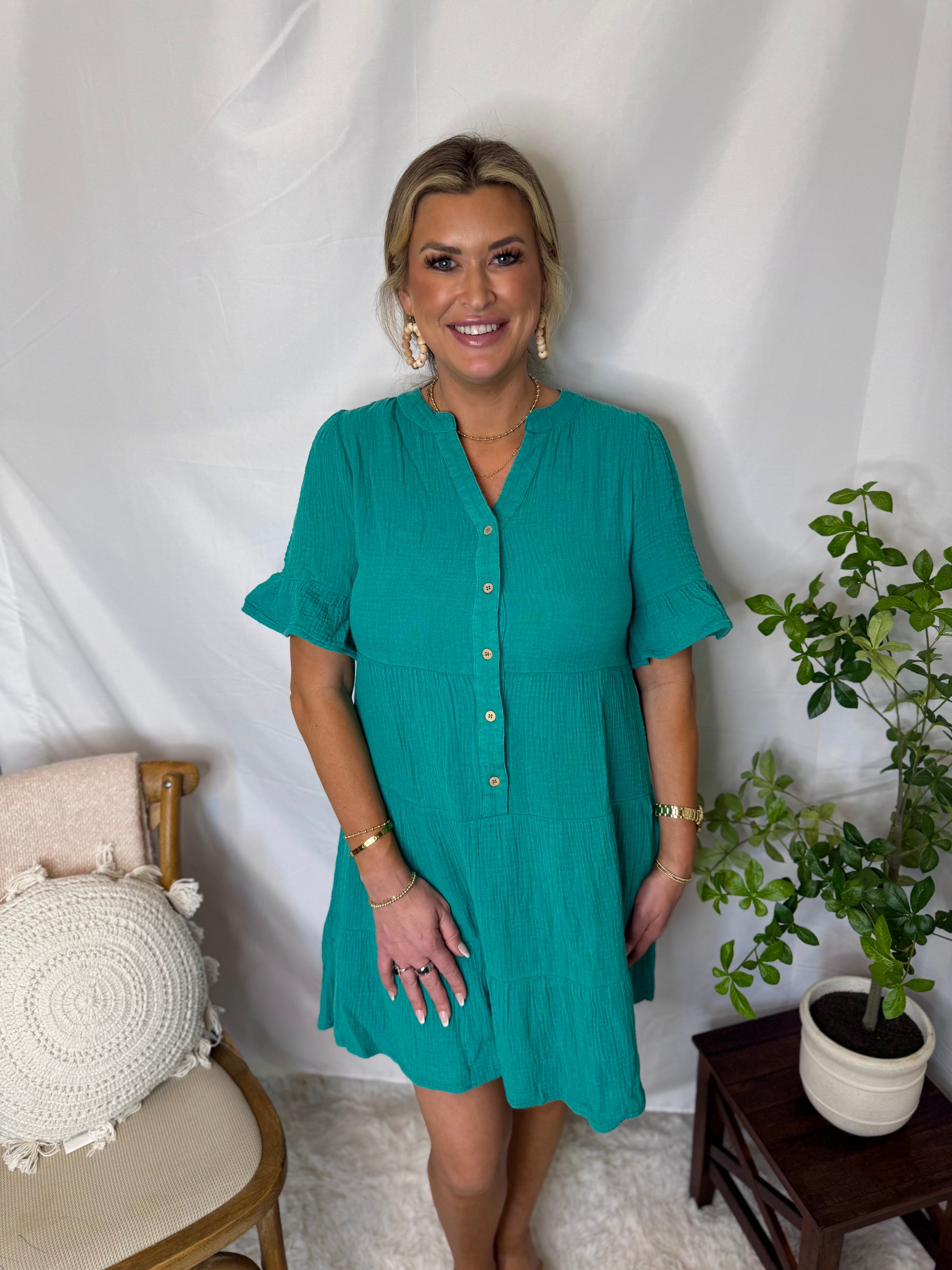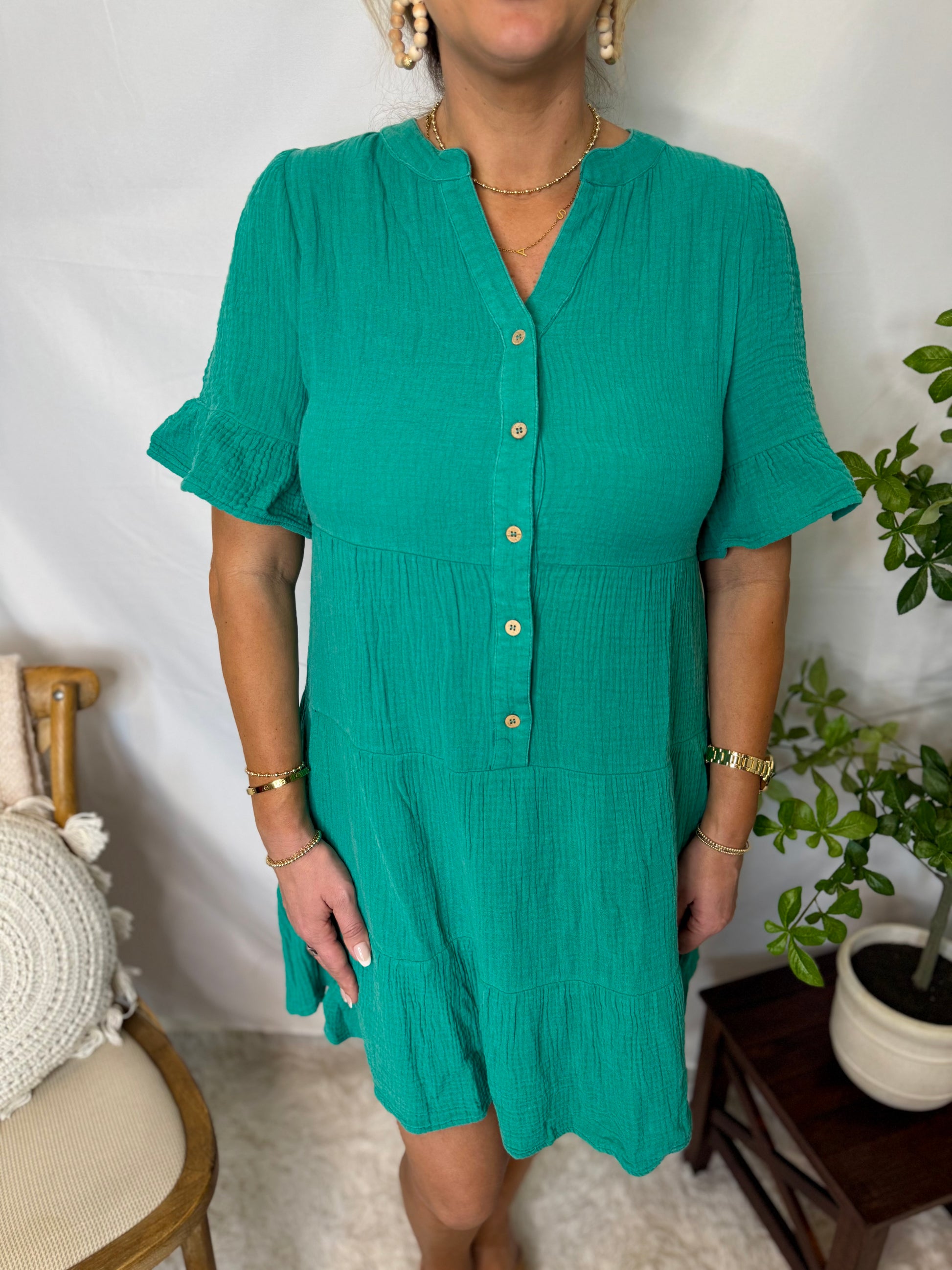 Mineral Washed Split Neck Baby Bell Sleeve Woven Mini Dress - Button Down - Short Sleeve - Tiered Layers