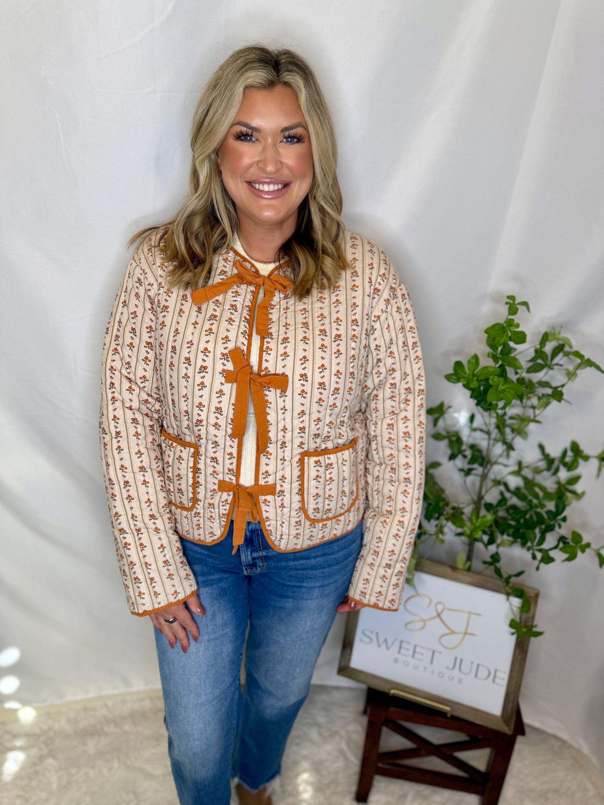 DARLING QUILTED PUFFER OUTERWEAR FEATURES: - COTTON FLORAL FABRICATION - CONTRAST PIPED EDGES - BOW TIE FRONT - PATCH POCKETS - GARMENT WASHED FOR EXTRA SOFTNESS - FULLY LINED