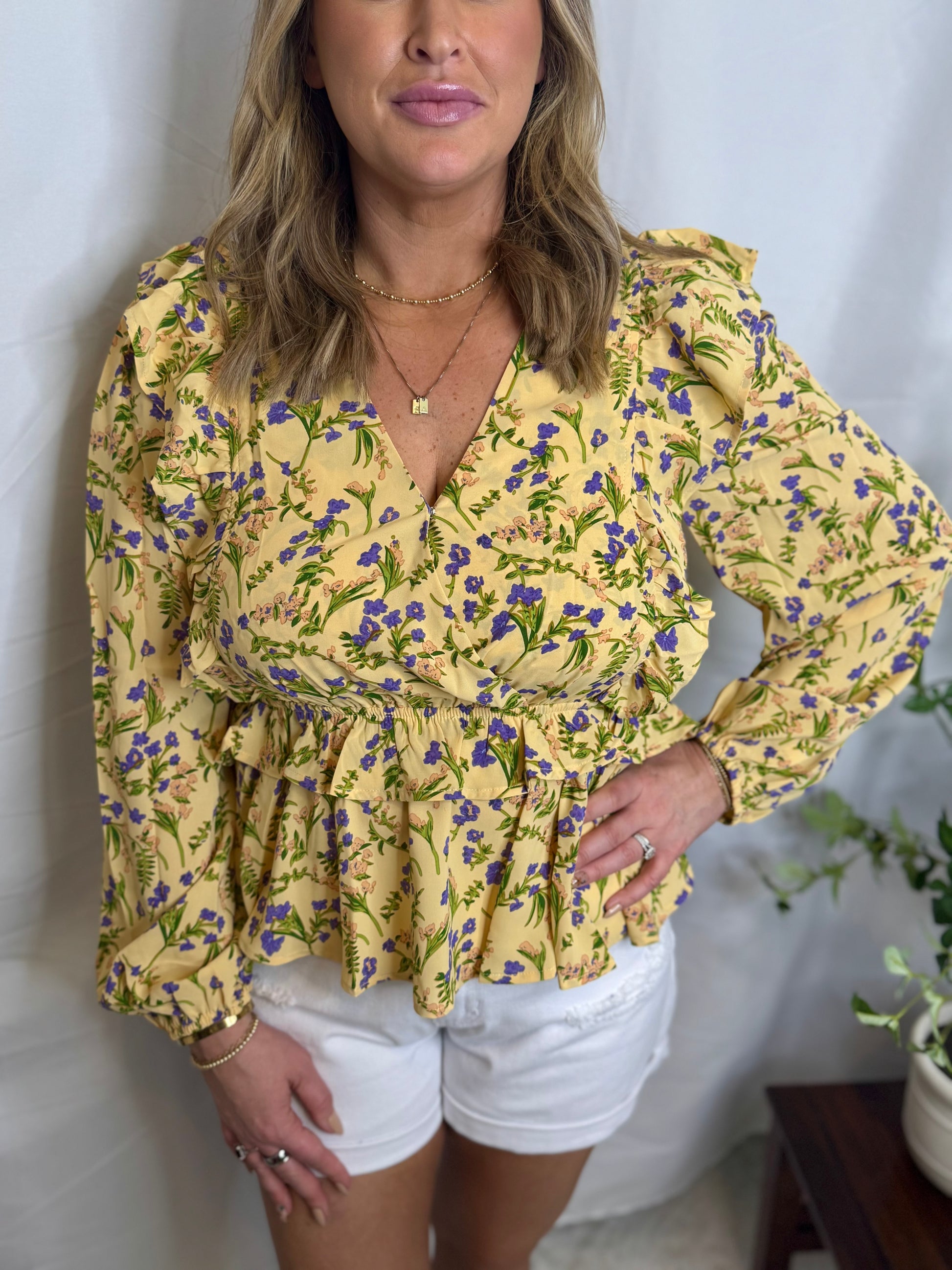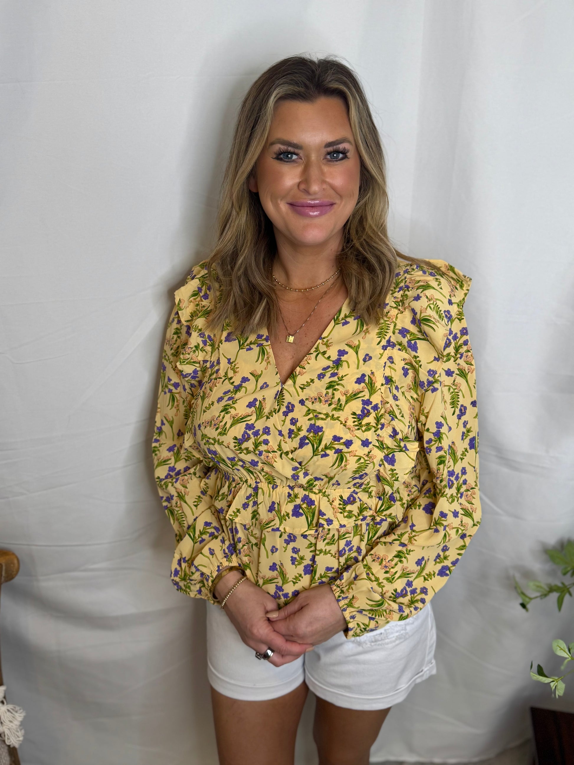 The Firefly Blouse is an adorable yellow floral blouse that is perfect for Spring! It features ruffle detailing and a button at the chest. This top does run small, so model sized up!