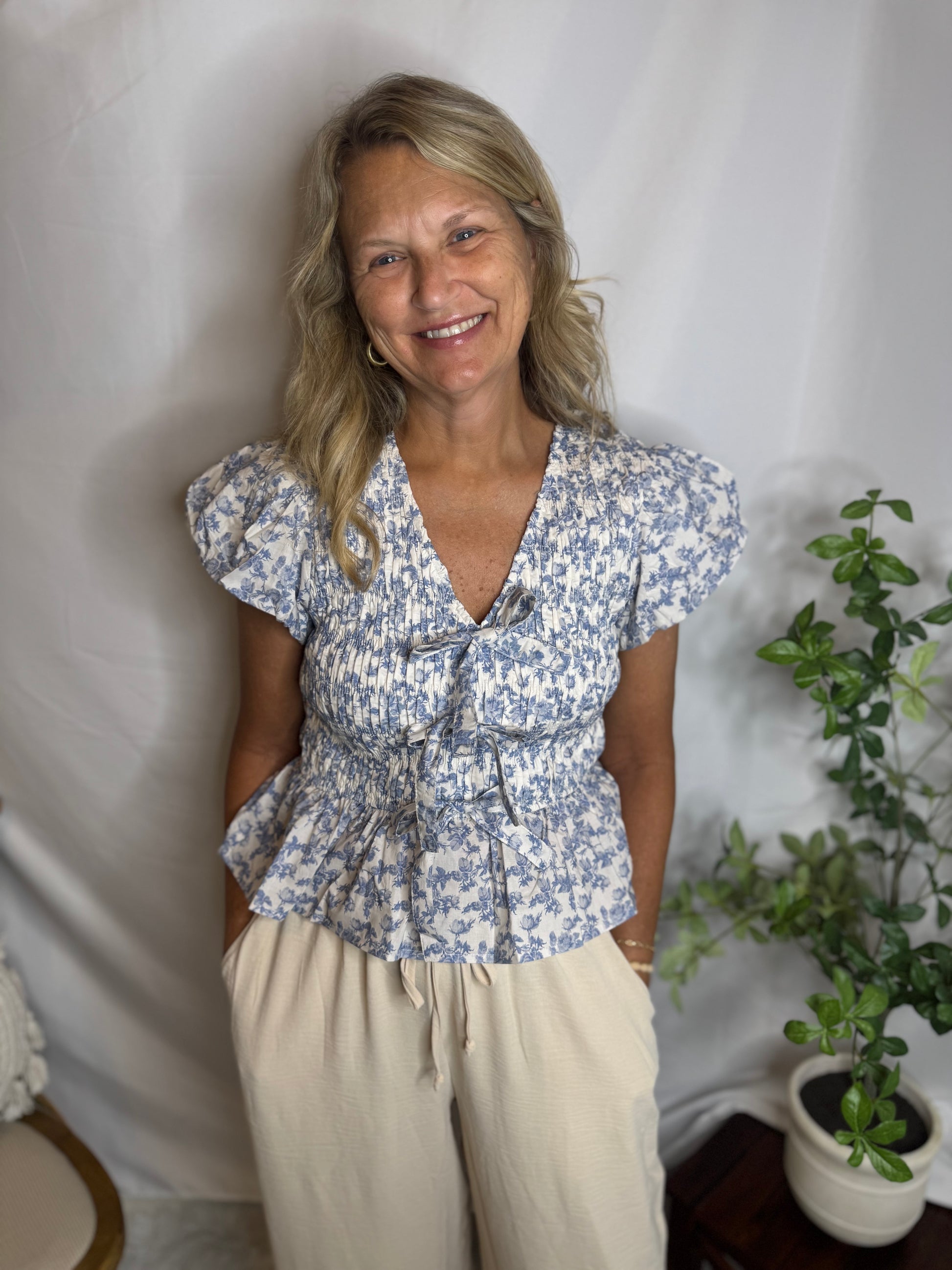 Effortlessly feminine and charming, the Blue Ribbon Top is your go-to for warm-weather style. Featuring a delicate blue floral print on a soft ivory background, this top offers a flattering smocked bodice with a peplum hem for a touch of playful movement. The flutter sleeves and front tie detail add just the right amount of romance, making it perfect for brunch dates, garden strolls, or casual Fridays. Pair it with high-waisted trousers or your favorite denim for a breezy, pulled-together look.