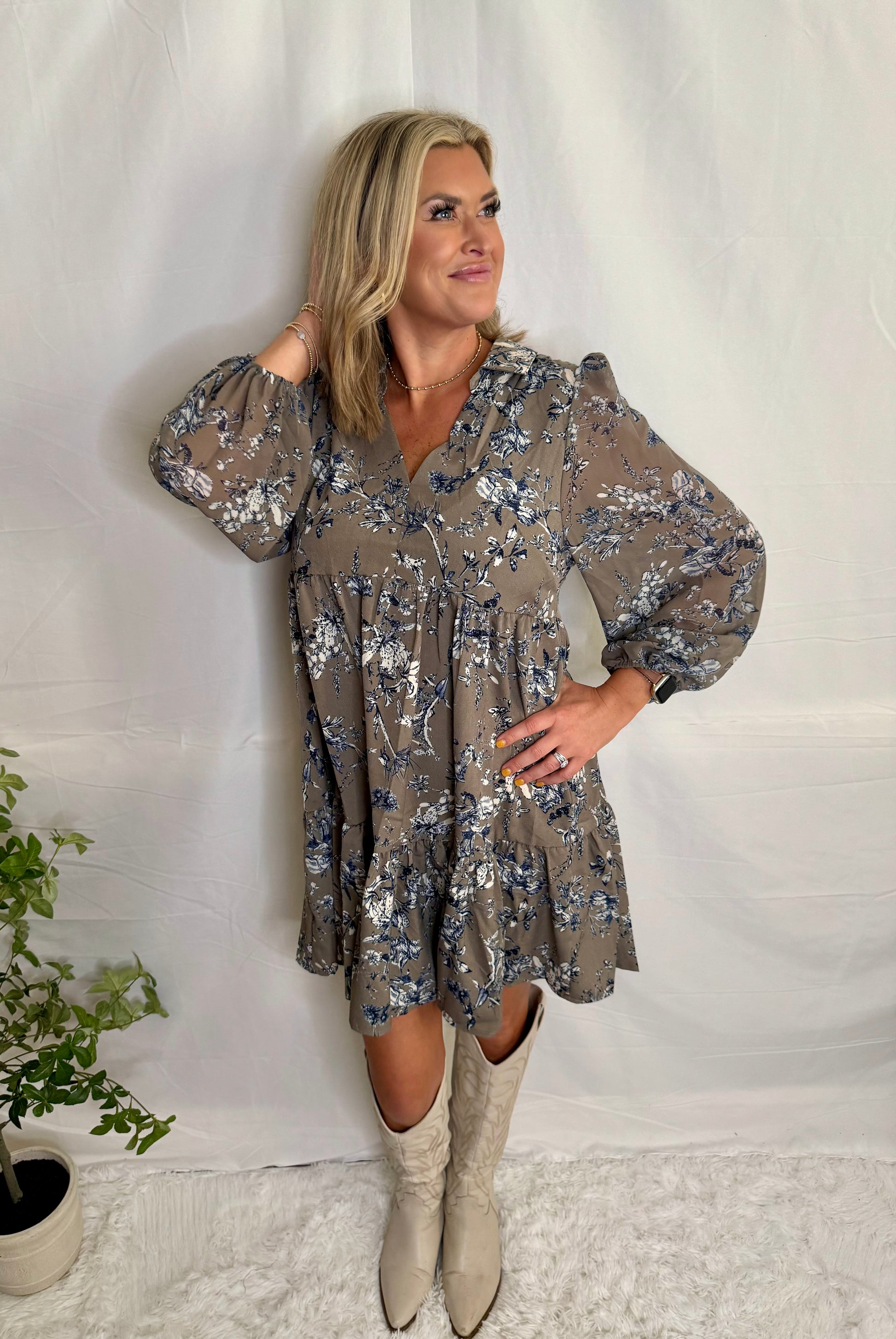 The Ella Dress is a gorgeous, yet comfortable dress that is perfect for work and play! The grey, cream, and blue design on this dress is gorgeous!