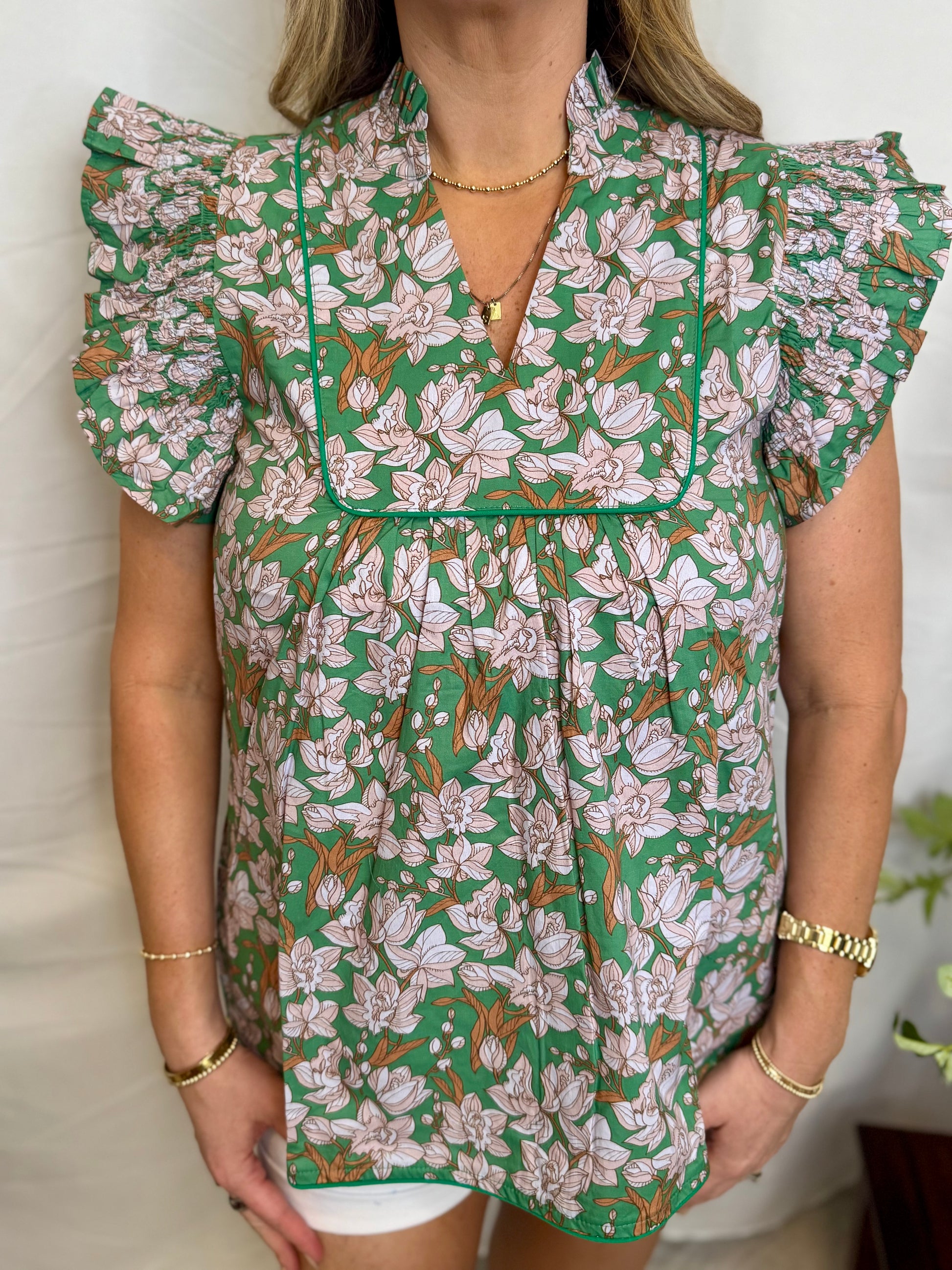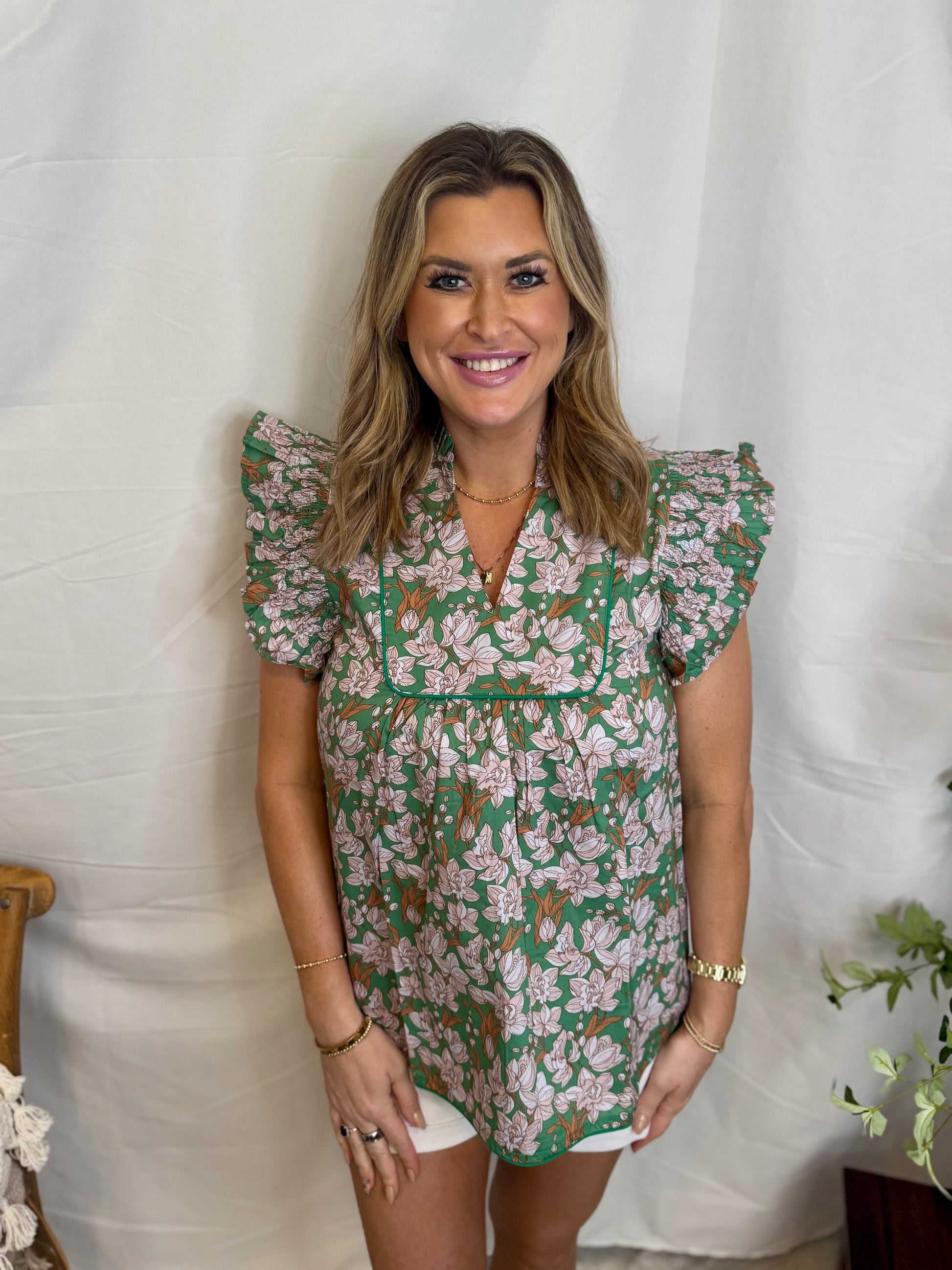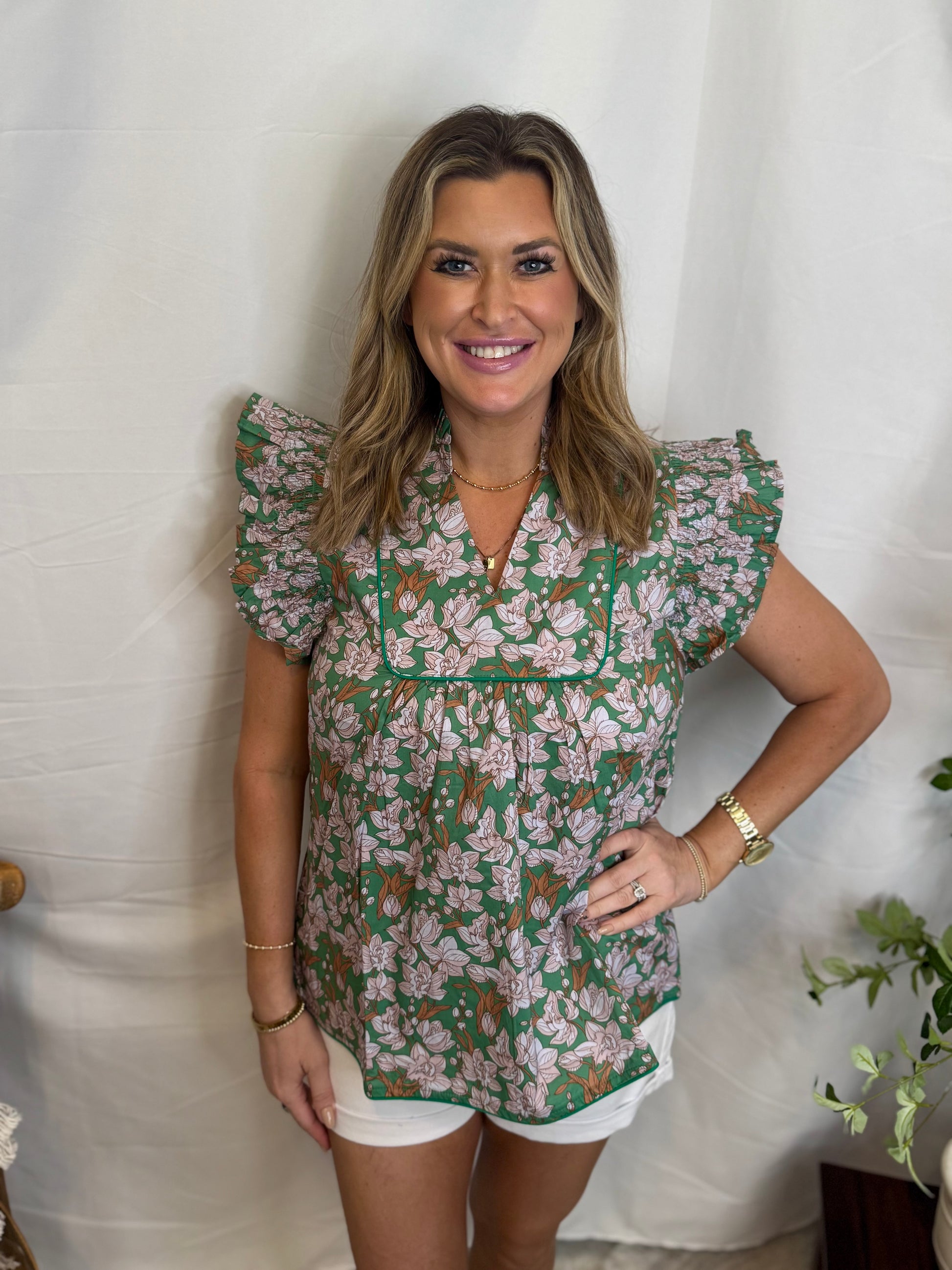 The Emmy Blouse is a v-neck blouse with ruffled sleeves. This top is super cute for spring!!