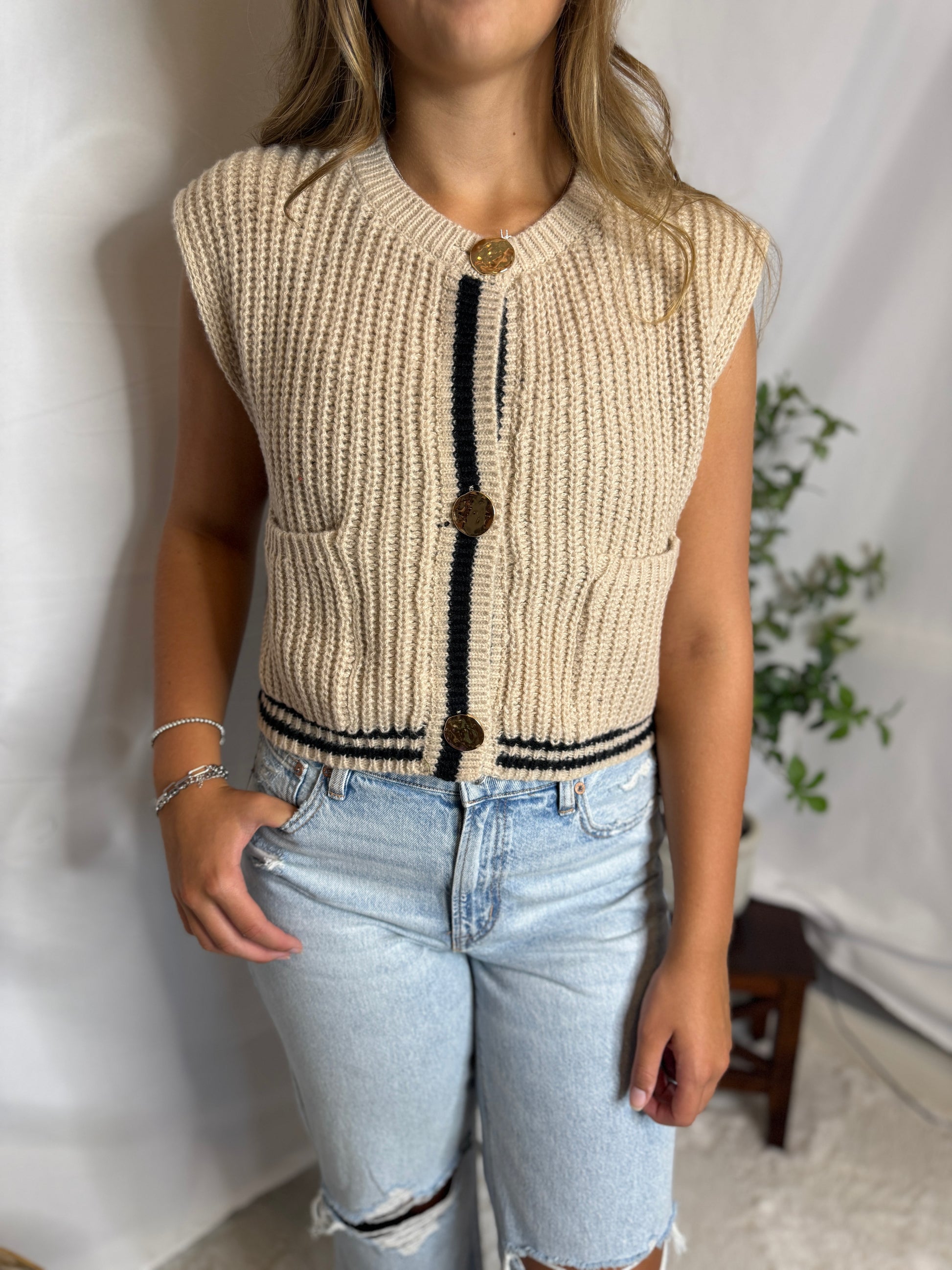 Timeless with a trendy twist — The Margot Sweater Vest features a soft, chunky knit in a neutral beige hue with bold black trim detailing and functional tortoise buttons. With a structured silhouette, front pockets, and sleeveless design, it’s perfect for layering or wearing on its own. Pair it with your favorite denim for an effortlessly chic look this season.
