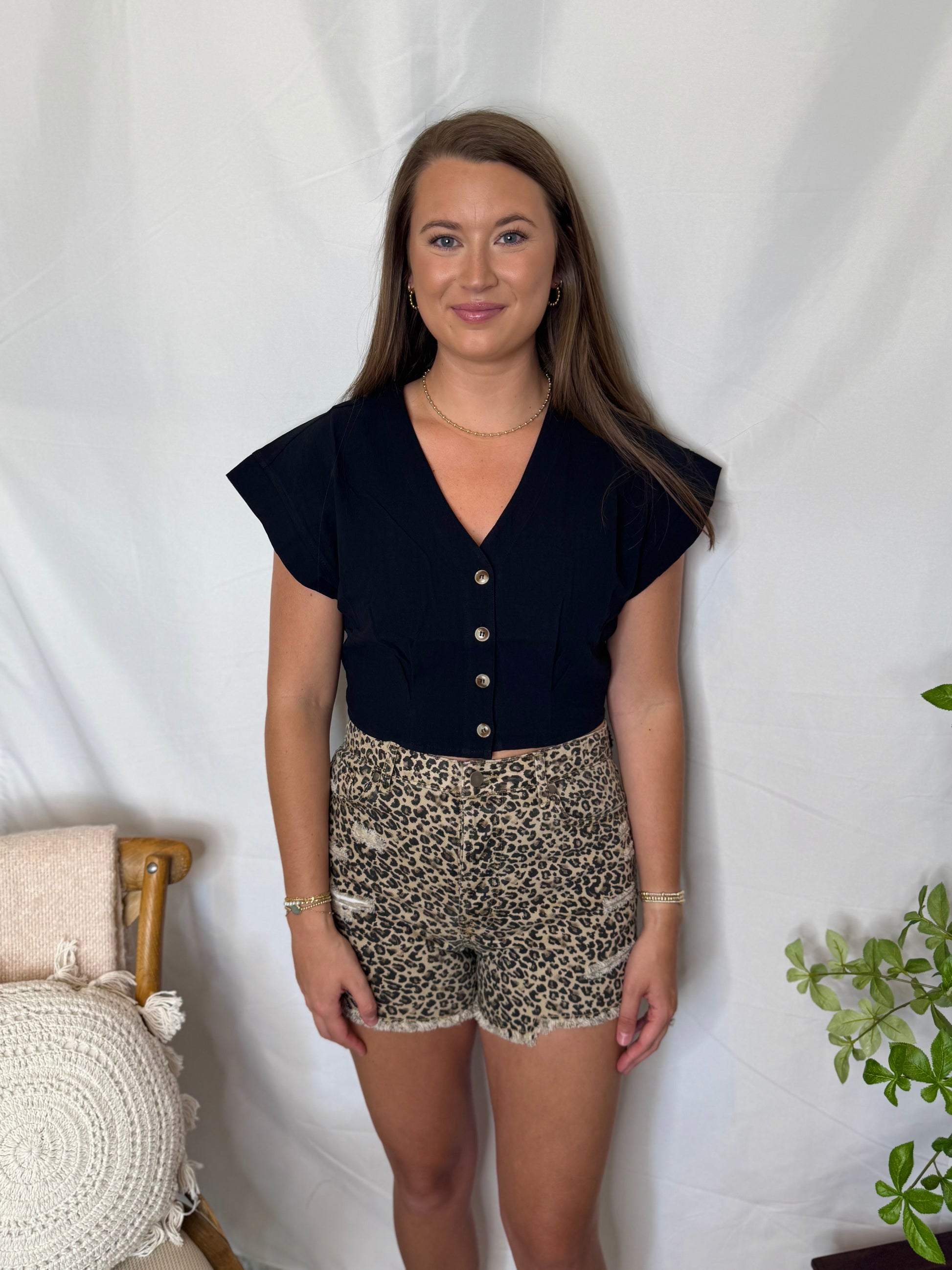 The Leopard Print Shorts are so trendy right now! They have slight distressing and buttons all the way up instead of a zipper.