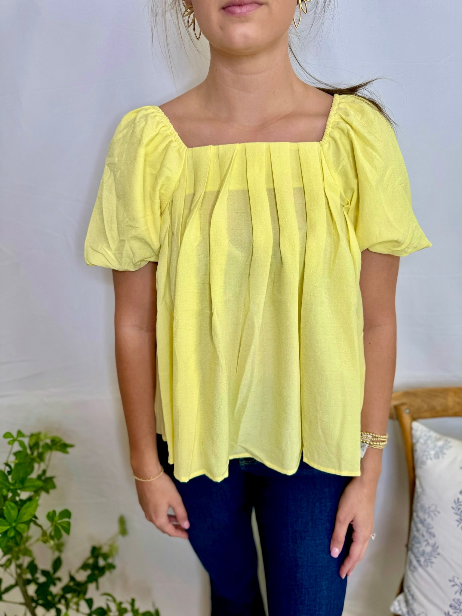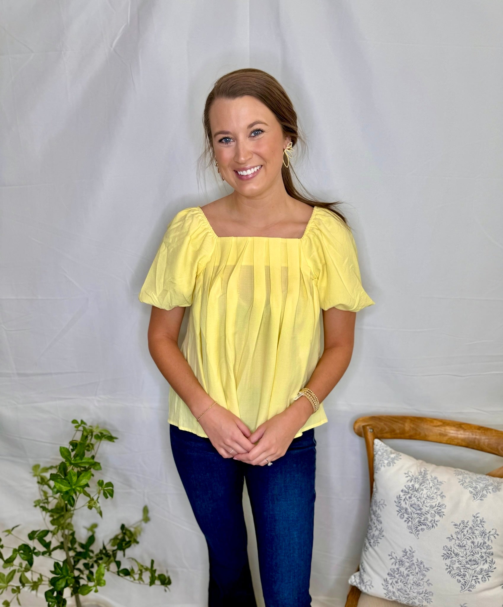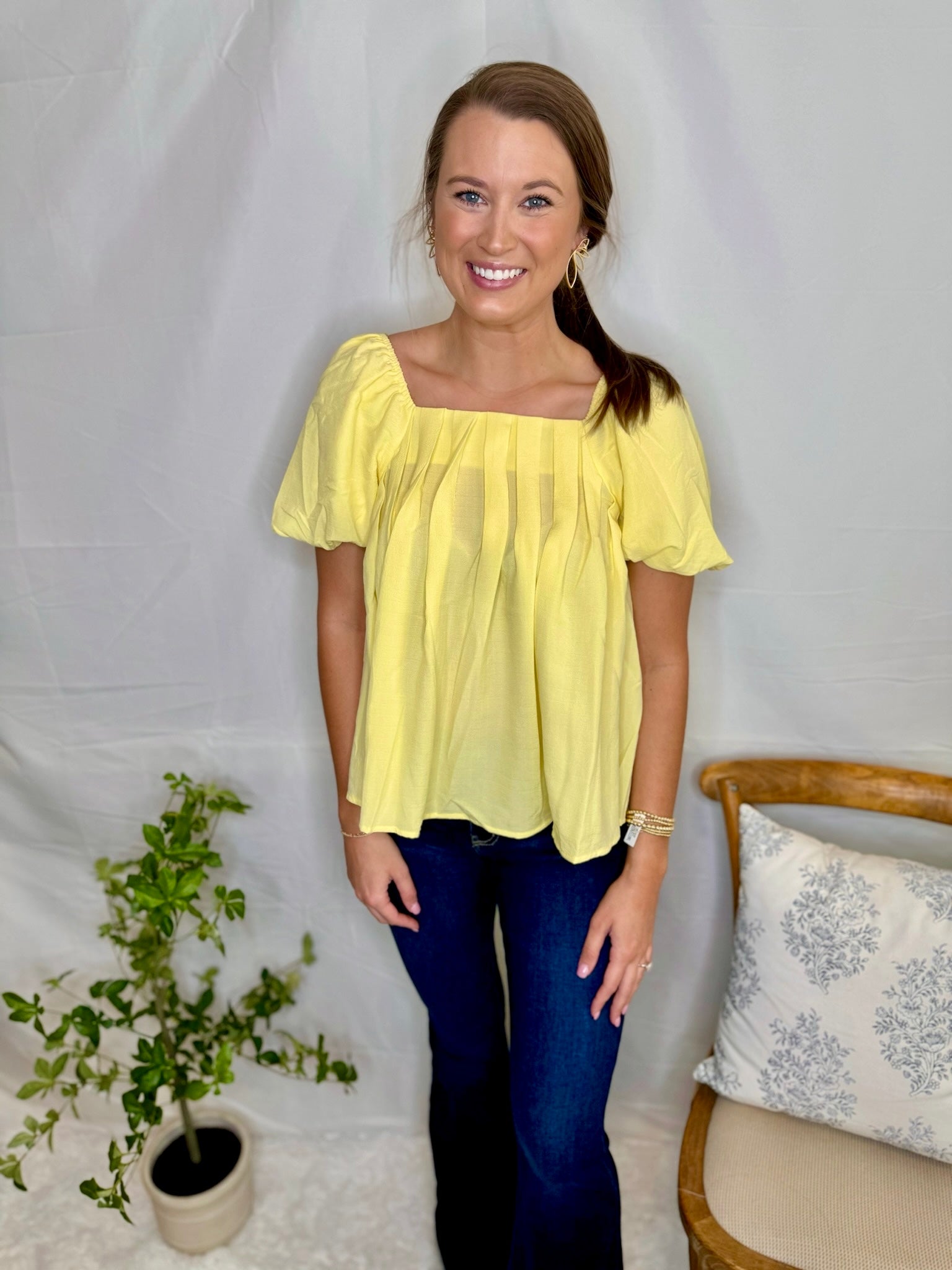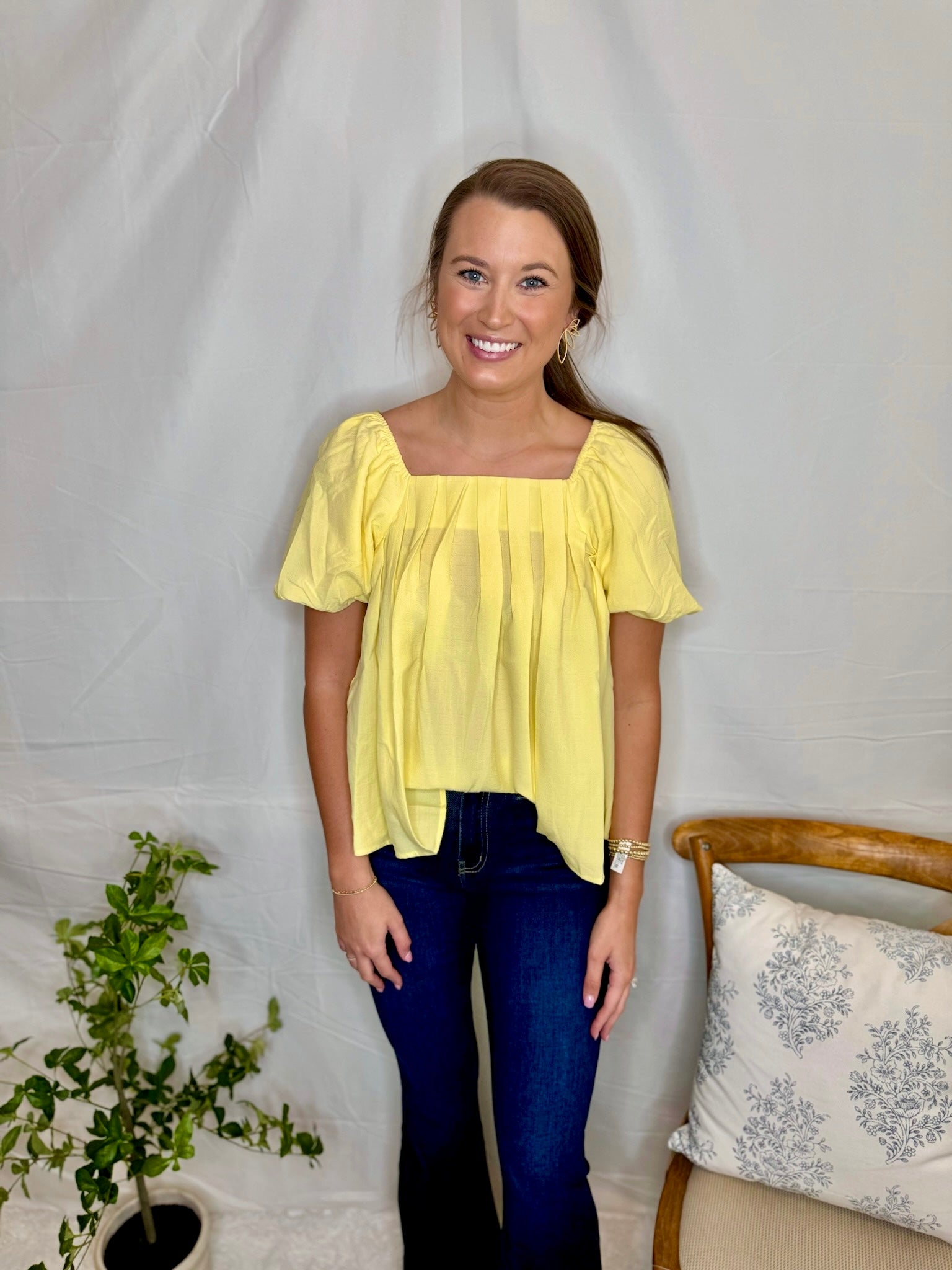 The Pleated Blouse in yellow is the cutest pleated blouse with balloon sleeves. This adorable top has a square neck and pairs perfect with white shorts or pants!