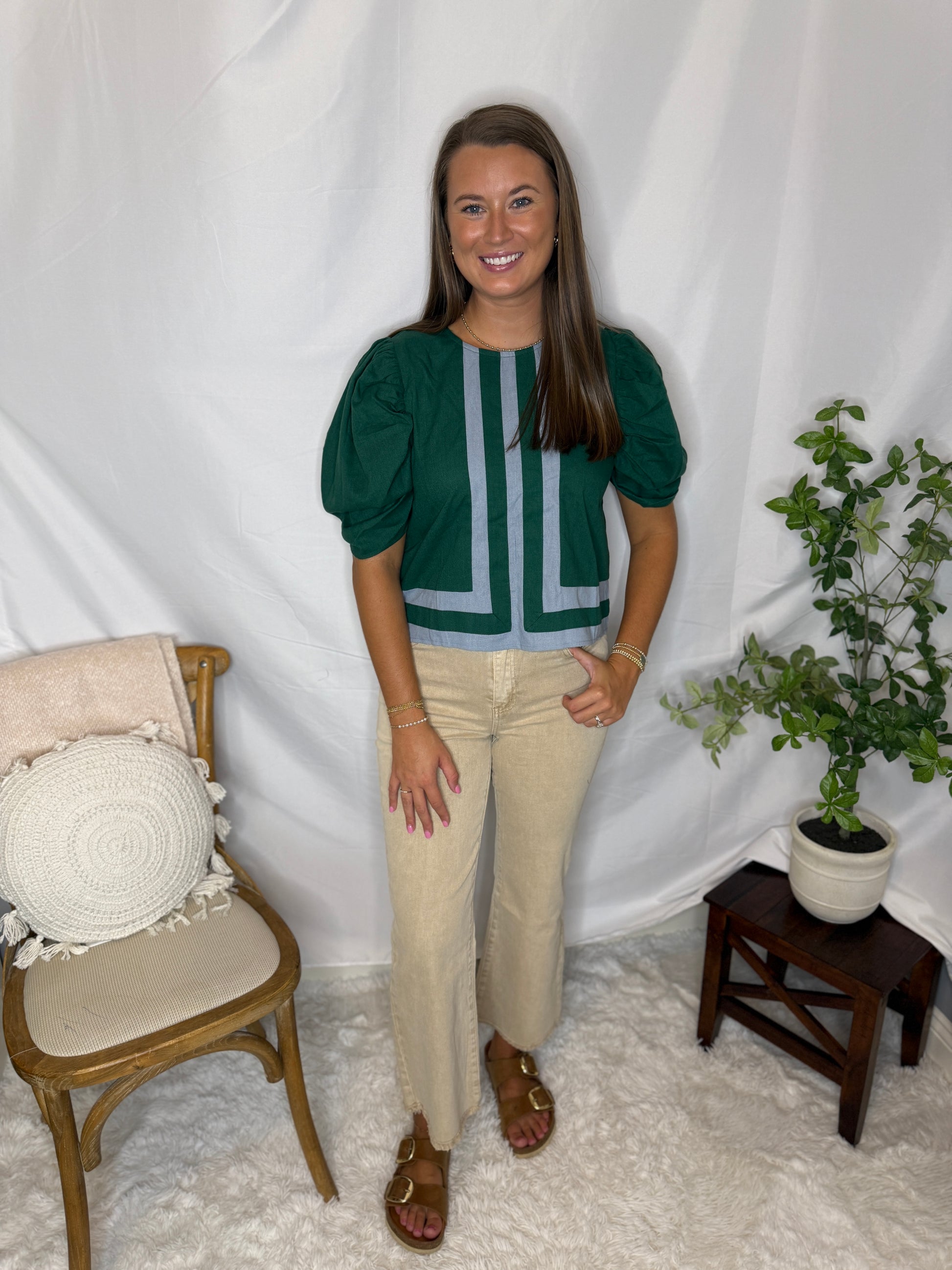 Add a bold pop to your wardrobe with this structured puff sleeve top! Featuring a modern geometric stripe design and dramatic puff sleeves, this piece is a standout in both chocolate brown and rich forest green. The contrast detailing adds a vintage-inspired touch, while the lightweight fabric keeps it comfy and breathable. Dress it up with trousers or keep it casual with your favorite denim.