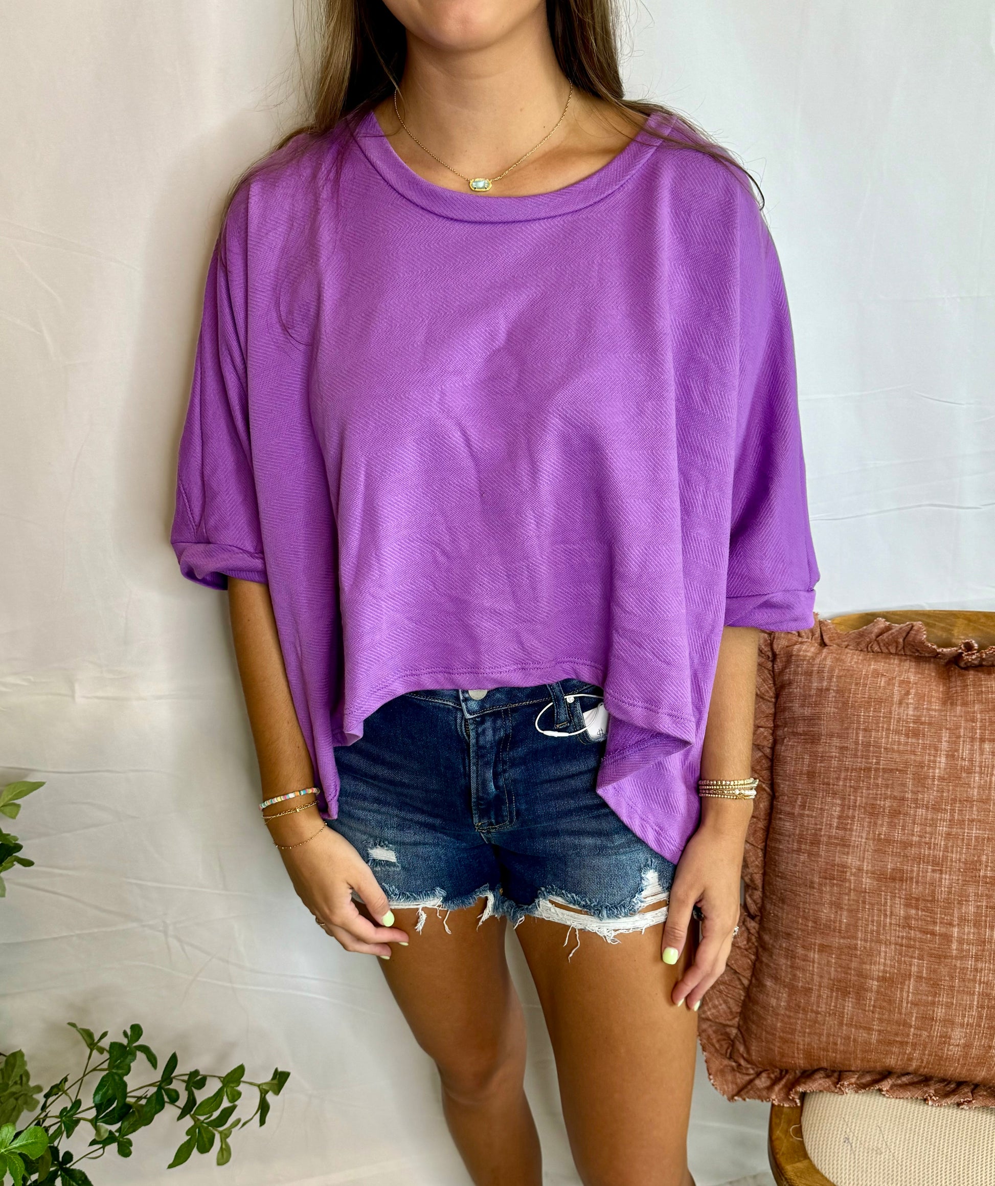 The Purple Game Day Top is a french terry semi crop top that has three quarter dolman sleeves. This top is oversized with a high low length! It is perfect for game day!
