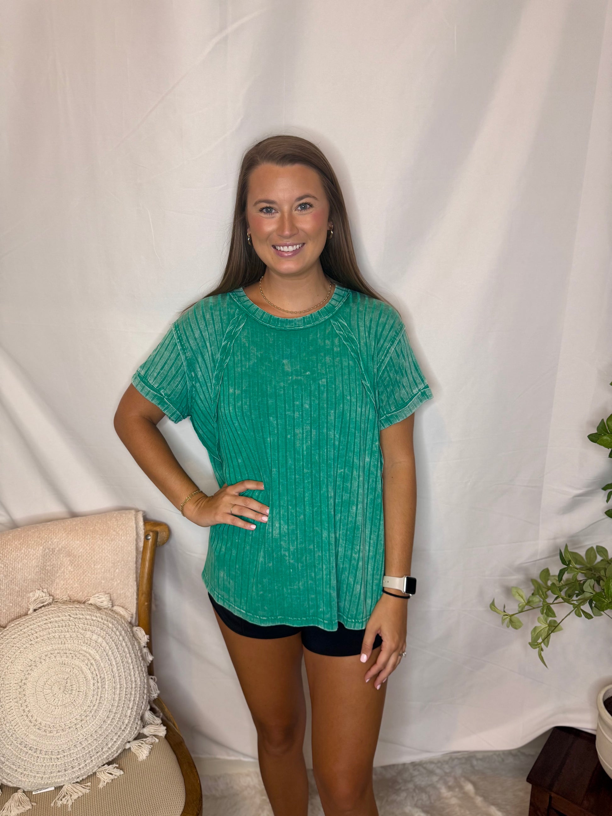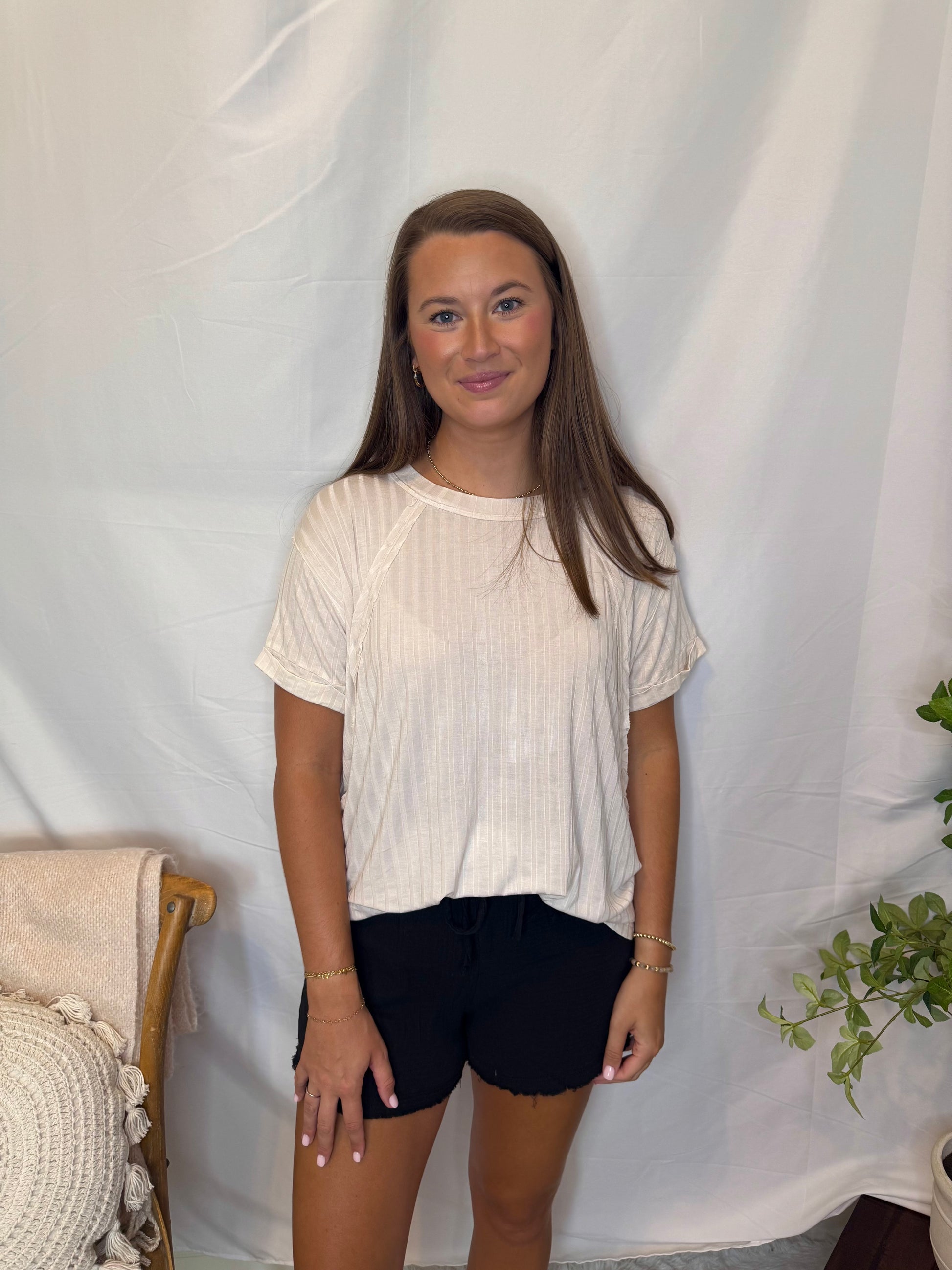 The Ribbed Boat Neck Tee is so soft and comfy!! It features a washed ribbed fabric, a raglan Dolan sleeve, and back patch detail! It is super soft and lightweight!
