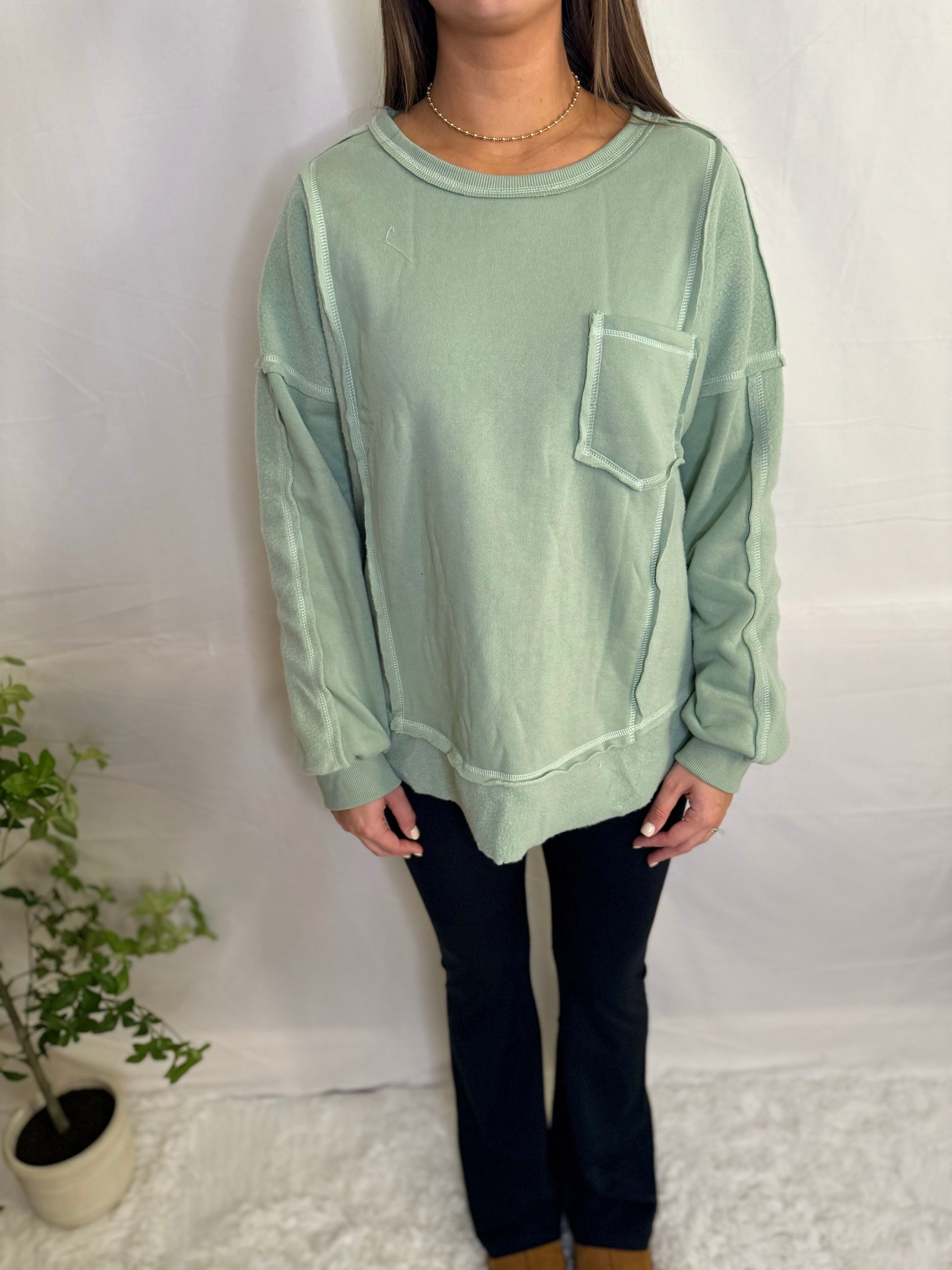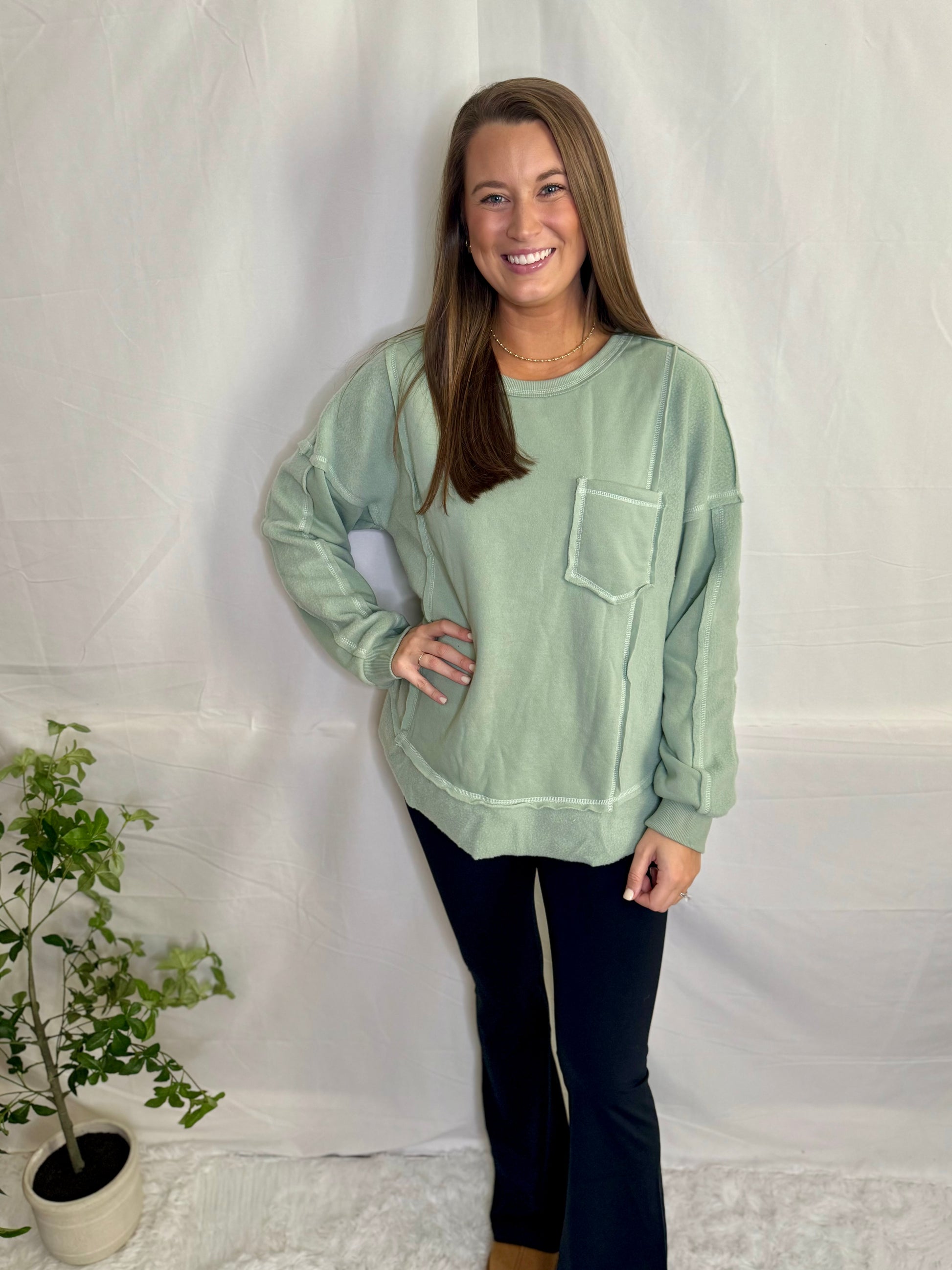 The Sage Comfy Top is a beautiful sage green oversized, comfortable top. It has raw edge detail and a patch pocket.