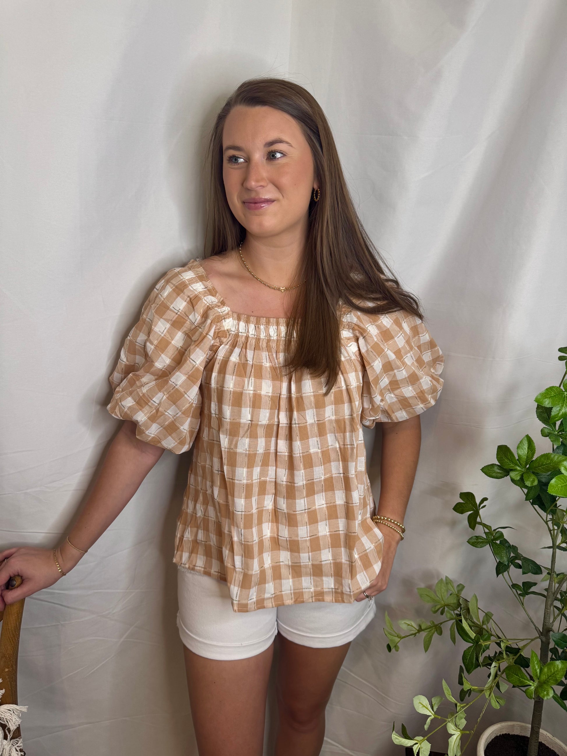 The Sand Checkered Top is the cutest blouse! This sand colored print is super cute and runs true to size.