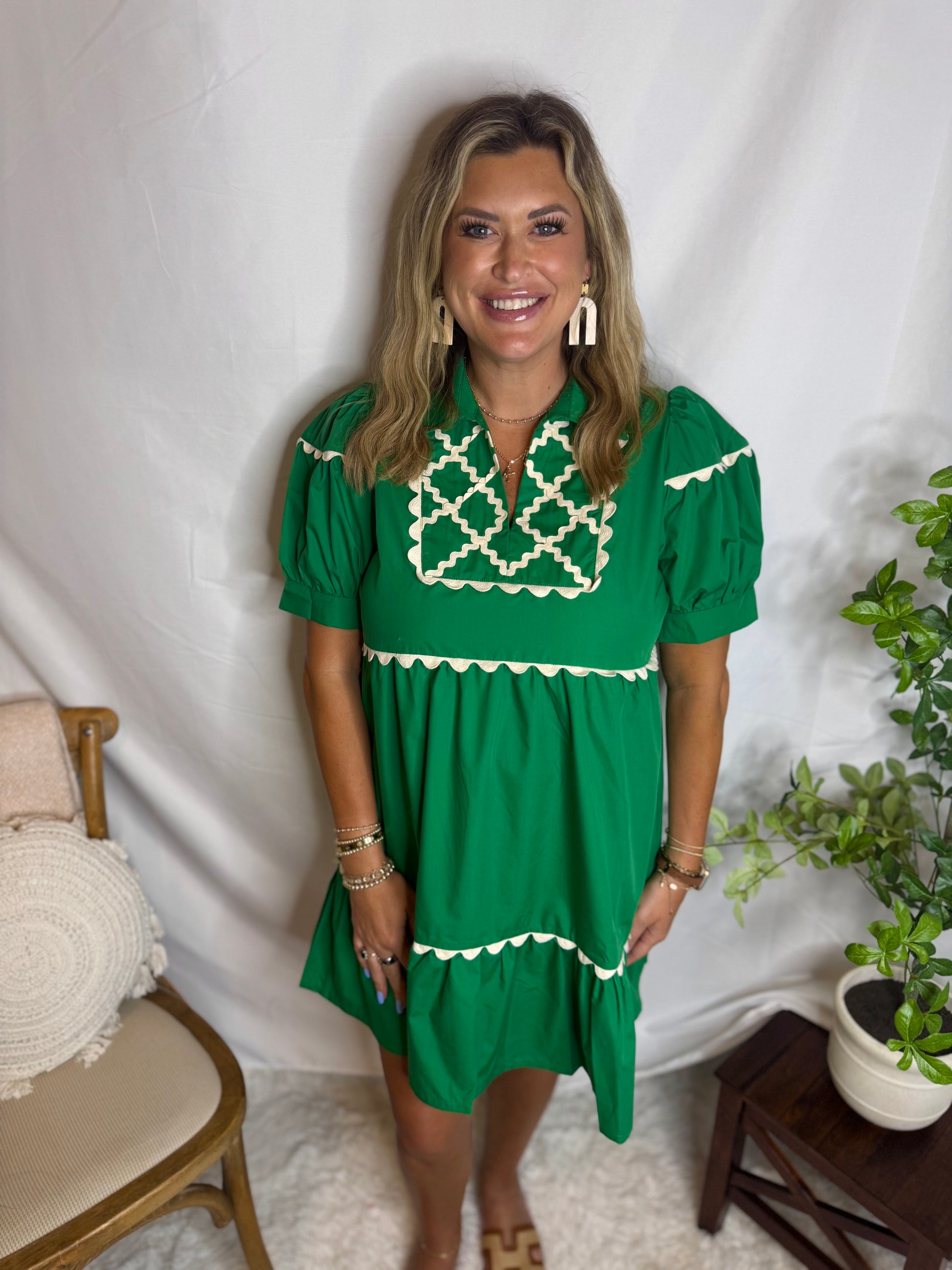 Brighten up your wardrobe with this vibrant Sassy Sprout Dress! Featuring a playful tiered silhouette and charming ivory scallop detailing, this dress brings a perfect blend of bold color and classic charm. The puff sleeves and statement embroidered neckline add a stylish twist, making it ideal for brunches, showers, or casual garden parties.
